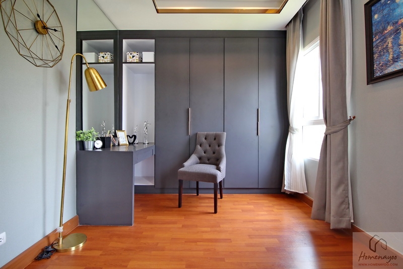 ผนังด้านในสุดบิวท์อินเป็นตู้เสื้อผ้าเต็มผนังให้สามารถเก็บเครื่องแต่งกายได้เป็นจำนวนมาก ส่วนมุมทางซ้ายวางโต๊ะเครื่องแป้งเข้ามุมเป็นระเบียบสำหรับนั่งแต่งหน้า