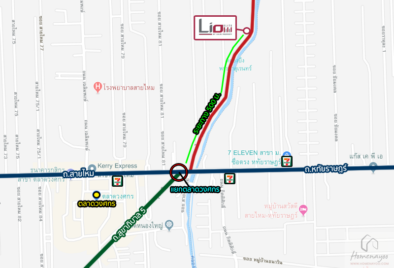 ถึงแล้วครับโครงการ ไลโอ อีลิท วัชรพล-สายไหม ตั้งอยู่ทางฝั่งซ้ายมือครับผม