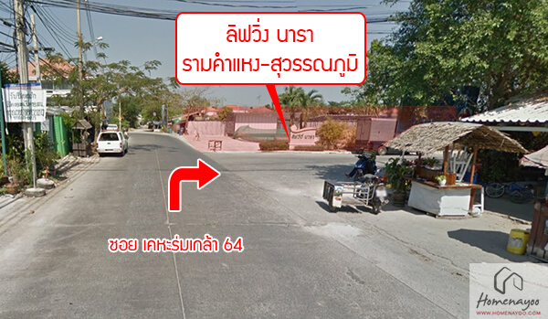 การเดินทาง ผมเริ่มจาก ถนนรามคำแหง แยกบ้านม้า (บิ๊กซีเอ็กซ์ตร้า สุขาภิบาล 3 ซ้ายมือ) > แยกมีสทีน > เลี้ยวขวาเข้าสู่ ถนนราษฎร์พัฒนา > ถนนเคหะร่มเกล้า > ซอยเคหะร่มเกล้า 64 > บ้านเดี่ยว ลิฟวิ่ง นารา รามคำแหง-สุวรรณภูมิ *โครงการอยู่ใน ซอยเคหะร่มเกล้า 64 ระยะทางถึงโครงการ 300 เมตร