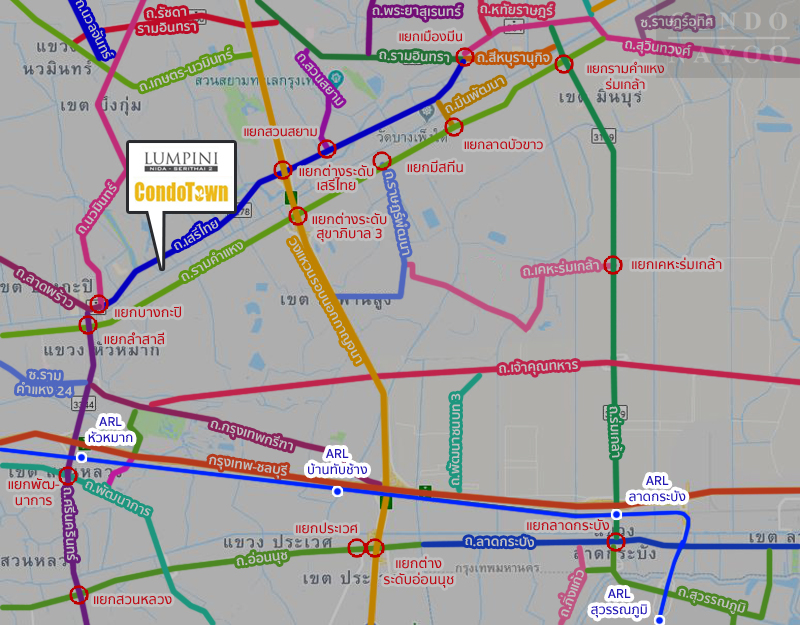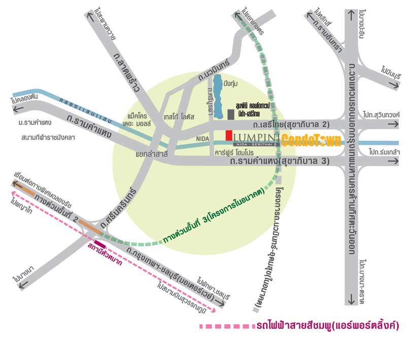 ทำเลที่ตั้งโครงการ – โครงการ Lumpini Condotown นิด้า-เสรีไทย 2 ตั้งยู่บนถนนถนนเสรีไทย เชื่อมต่อกับถนนหลายสาย เข้า-ออกตัวเมืองกรุงเทพได้สะดวกและไม่ไกลจากวงแหวนรอบนอกกาญจนา โดยรอบเป็นย่านพักอาศัย มีร้านค้า ร้านอาหาร เดินทางไปยังห้างสรรพสินค้า สถานศึกษา สถานที่ราชการได้สะดวก
