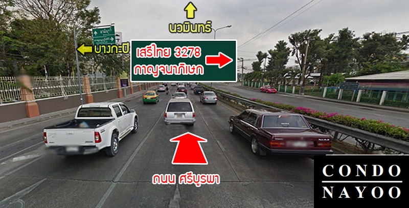 วิ่งตรงไปตาม ถนนเสรีไทย จนถึงโครงการ ระยะทาง 1 กิโลเมตร