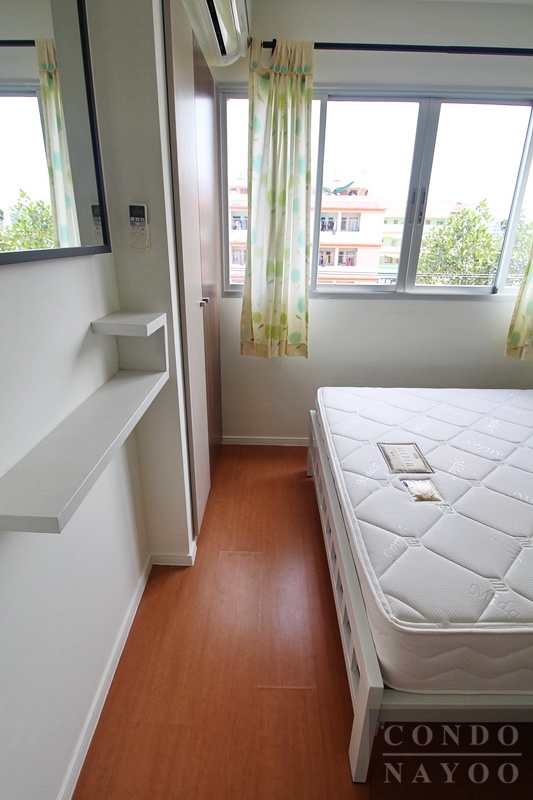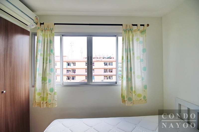 ภายในห้องดูสว่างและโปร่ง มีหน้าต่างกระจกบานใหญ่ พื้นที่ในห้องวางเตียง ตู้เสื้อผ้าและชั้นวางเครื่องสำอางได้