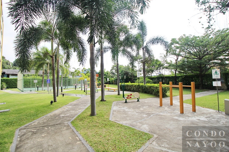 พื้นที่สวนด้านหลังโครงการ จะมีพื้นที่ออกกำลังกายและทางเดินเล่นในสวน