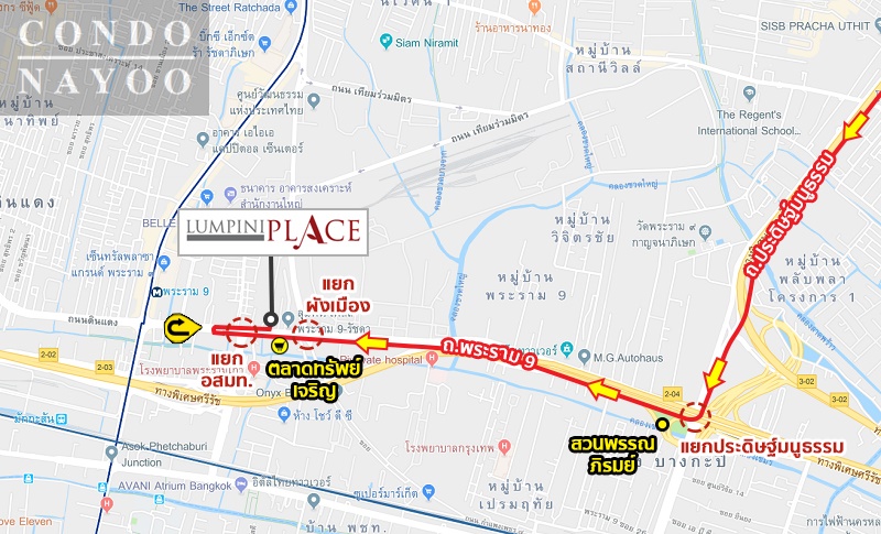 ทำเลที่ตั้ง โครงการ LUMPINI PLACE พระราม 9 – รัชดา ตั้งอยู่ติด ถ.พระราม 9 ตรงหัวมุมระหว่าง ถ.พระราม 9 กับ ถ.วัฒนธรรม โดยอยู่ฝั่งขาออกจากแยกพระราม 9 เพียง 650 เมตรเ ทำเลนี้เป็นย่านที่อยู่อาศัย และเป็นทำเลทองที่กลายเป็น New Central Business District ติดถนนใหญ่จะเป็นอาคารสูง ทั้งอาคารสำนักงานขนาดใหญ่, คอนโดมิเนียม, แหล่งช้อปปิ้งขนาดใหญ่ และแหล่งการศึกษา เชื่อมต่อ CBD ชั้นในอย่างอโศกได้สะดวก เพียง 3 กม.ถึง ถ.อโศกมนตรีค่ะ