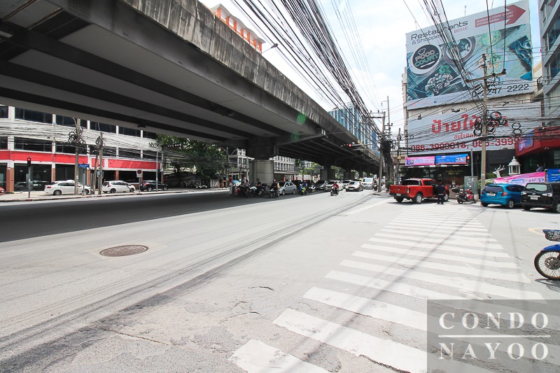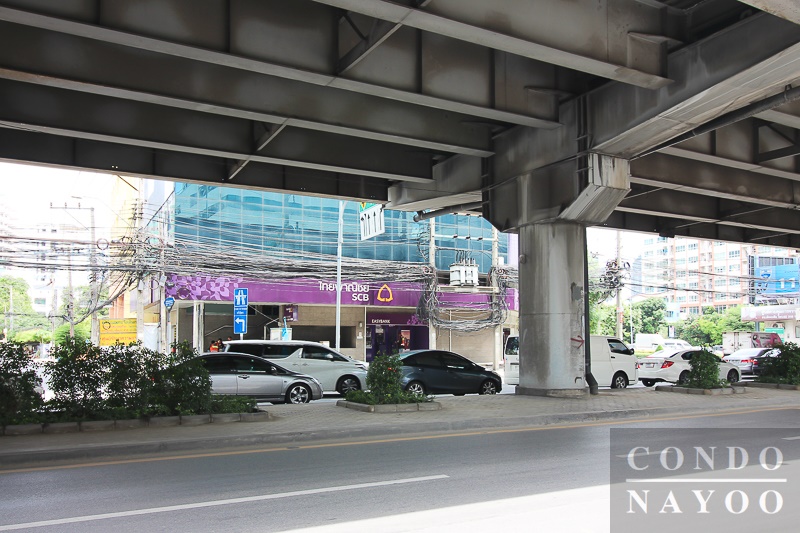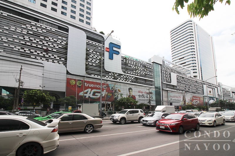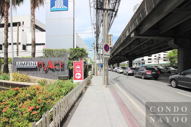 ตอนนี้เราอยู่ที่หน้าทางเข้าหลักของโครงการบน ถ.พระราม 9 กันแล้ว เดี๋ยวเราจะเดินสำรวจทำเลโดยรอบโครงการด้วยกันเลยค่ะ