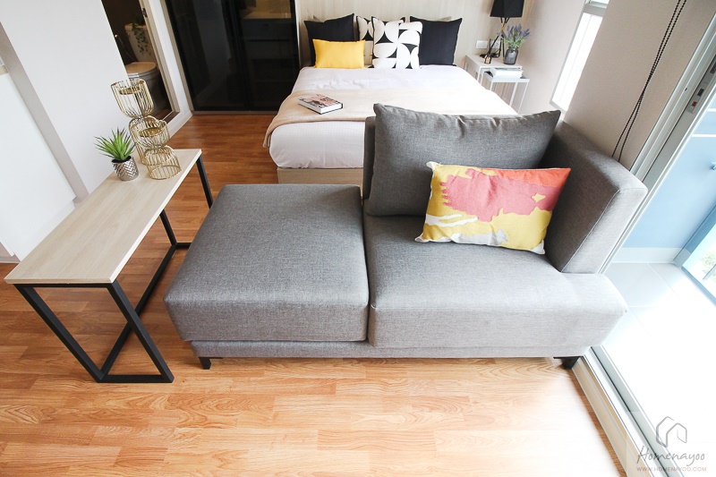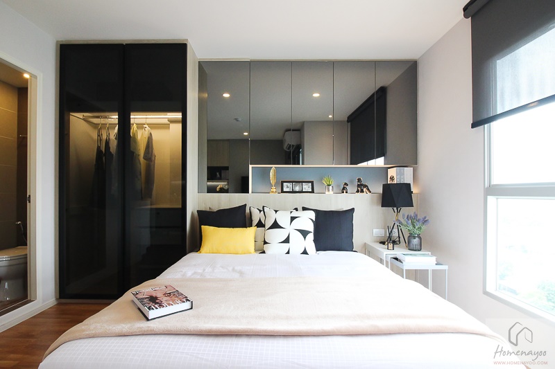ส่วนที่แตกต่างจากห้อง Studio ก็คือการกั้นผนังระหว่าง Living Area และห้องนอนทำให้ห้องเป็นสัดส่วนมากยิ่งขึ้น โดยที่ผนังจะเจาะช่องทำเป็นหน้าต่างเอาไว้ให้ด้วย ทำให้ห้องดูโปร่งมากขึ้น แต่ถ้าใครที่ต้องการความเป็นส่วนตัวในวันที่มีเพื่อนหรือมีแขกมาหา ก็สามารถติดม่านหรือมูลี่เพิ่มเติมได้ค่ะ