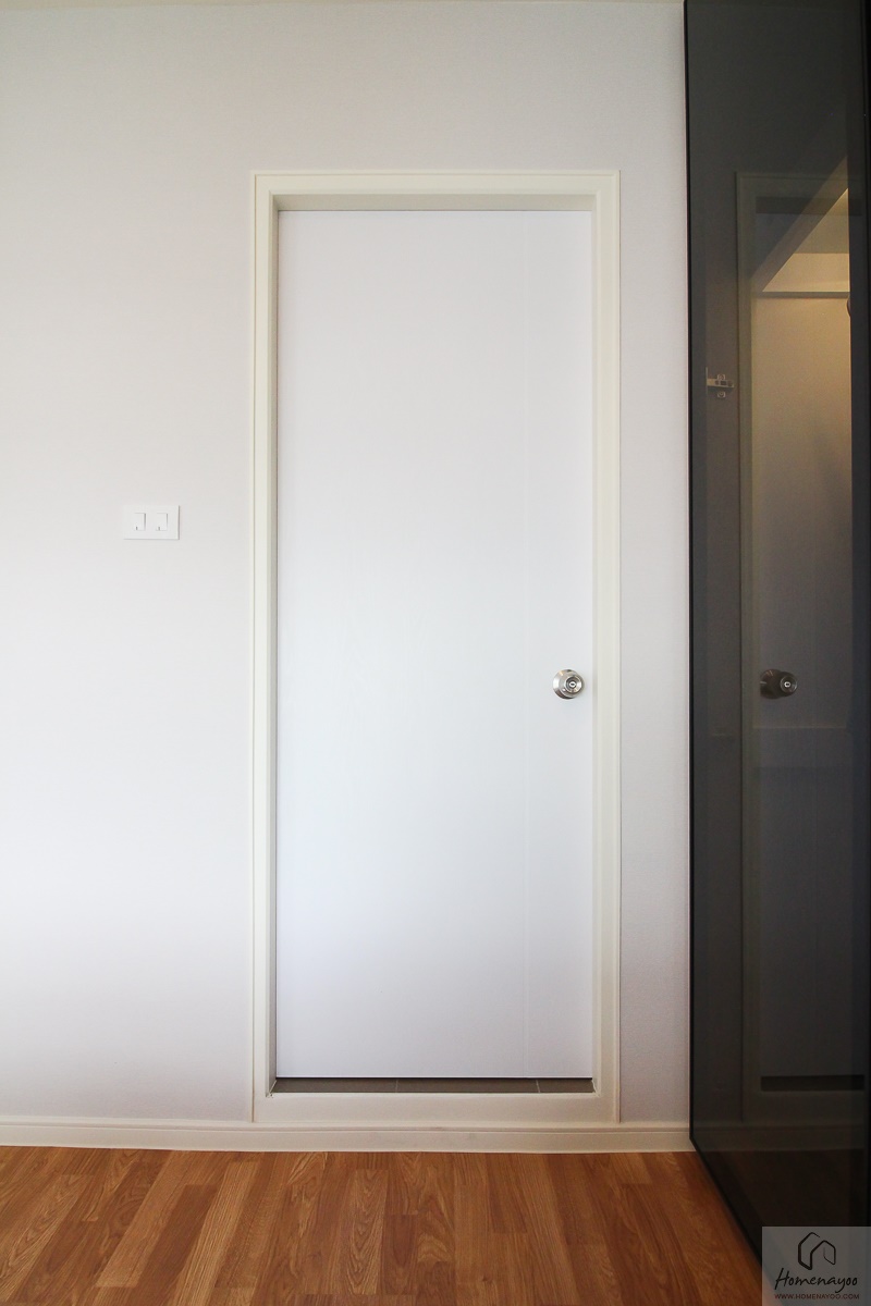 เริ่มจากประตูห้องใช้ประตูบาน HDF ติดมือจับลูกบิดสแตนเลส สามารถบิดล็อกได้จากด้านใน และติดตาแมวมาให้ด้วย