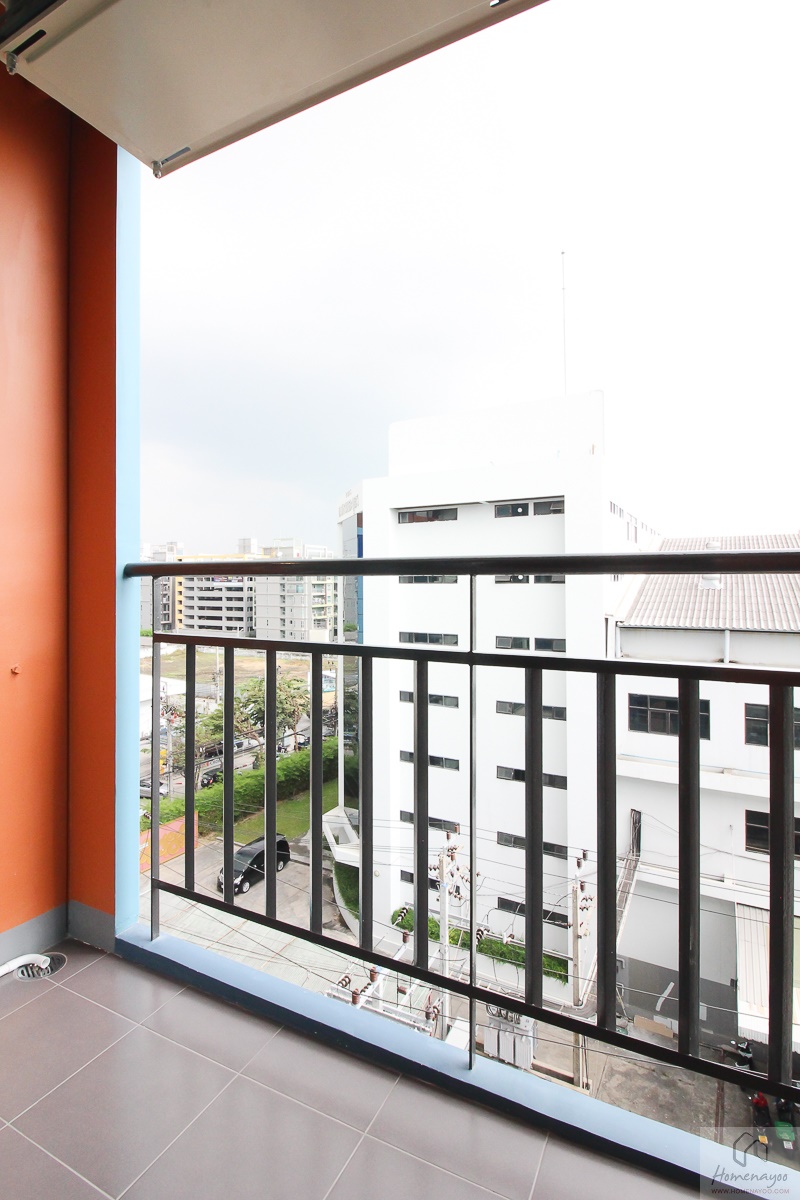 พื้นที่ระเบียงเป็นจุดที่ใช้วางเครื่องซักผ้าและตากผ้า โดยจะมีราวตากผ้าแบบพับเก็บได้ติดตั้งมาให้ ส่วน Compressor จะถูกยกขึ้นไปแขวนข้างบนเพื่อให้เราสามารถใช้พื้นที่ระเบียงได้อย่างเต็มที่ค่ะ