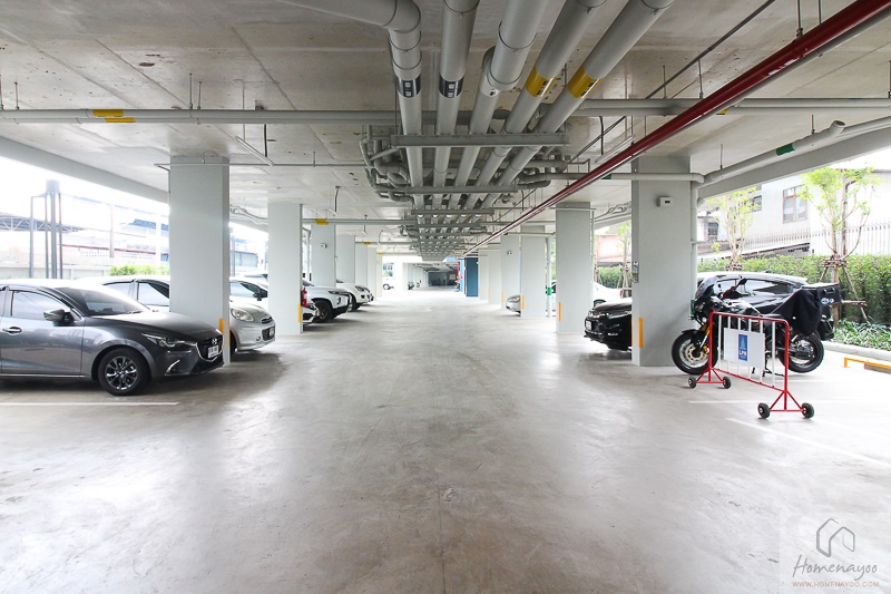 พอเข้ามาด้านในโครงการ ส่วนแรกจะเป็นพื้นที่จอดรถกลางแจ้ง มีการเดินรถแบบ Two Ways และจะวนเข้าไปใต้อาคารเป็นพื้นที่จอดรถในร่มทั้งหมด รวมมีที่จอดรถ 32% ของจำนวนยูนิตพักอาศัย ไม่รวมจอดซ้อนคัน