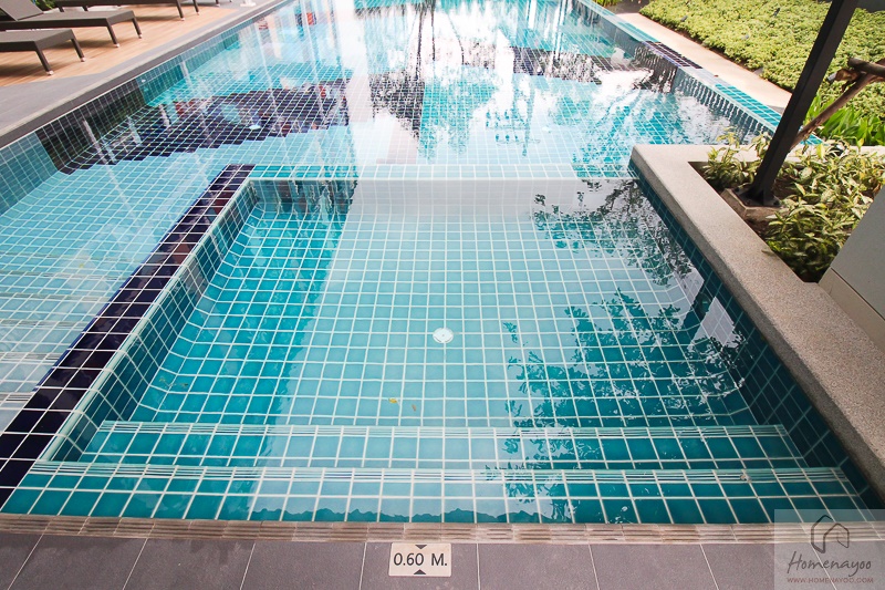 เริ่มจากสระว่ายน้ำเป็นสระระบบเกลือ มีขนาดสระ 15 x 6.5 เมตร สามารถใช้ว่ายน้ำออกกำลังกายได้สบาย ภายในสระแบ่งโซนสระเด็กให้ มี Pool Deck พร้อม Outdoor Shower สำหรับล้างตัว และ Sunbed สำหรับนอนพักผ่อน