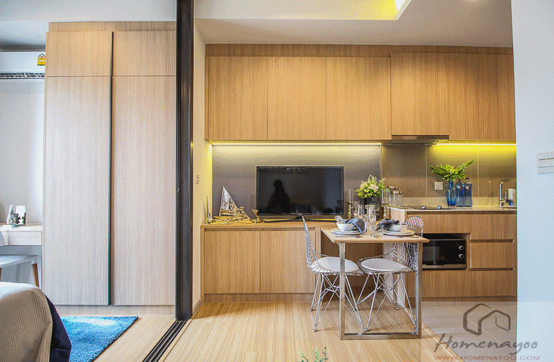 เดินเข้าห้องมาเจอส่วนห้องครัวก่อน ได้เป็นครัวเปิด เชื่อมกับส่วนห้องนั่งเล่น และส่วนรับประทานอาหารด้านใน ในสุดเป็นระเบียง ซ้ายมือมีทางเดินไปยังห้องนอน 2 ห้อง และห้องน้ำ