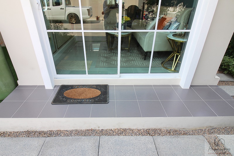 เราเข้าไปดูภายในบ้านตัวอย่างด้วยกันเลยค่ะ พื้นเฉลียงทางเข้าบ้านยกระดับขึ้นมา 15 ซม. ปูด้วยกระเบื้องเซรามิก ประตูทางเข้าบ้านเป็นประตูบานเลื่อน ใช้ชุดประตูอะลูมิเนียมสีขาวติดกระจกเขียวตัดแสง เพิ่มตัวล็อกที่กลางบานเพื่อความปลอดภัย ติดไฟกิ่งให้ทั้ง 2 ฝั่งของประตู