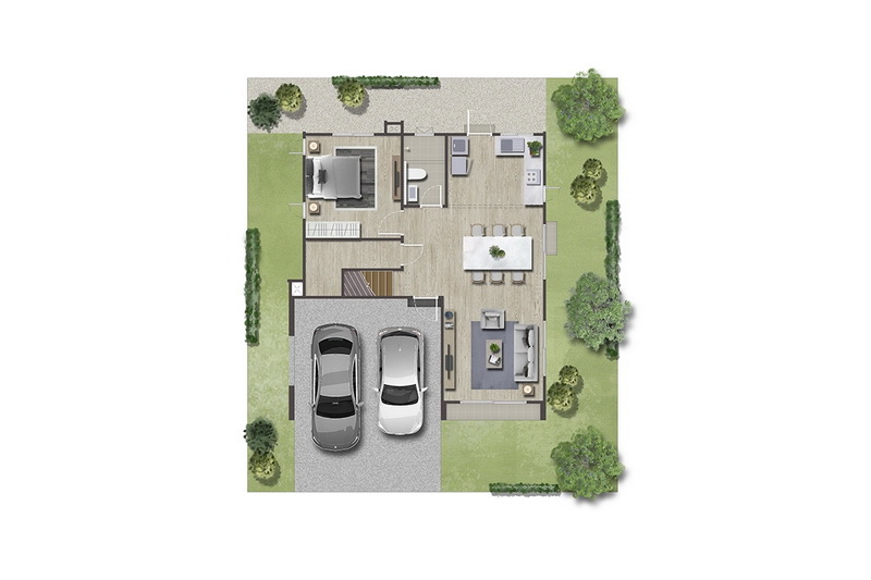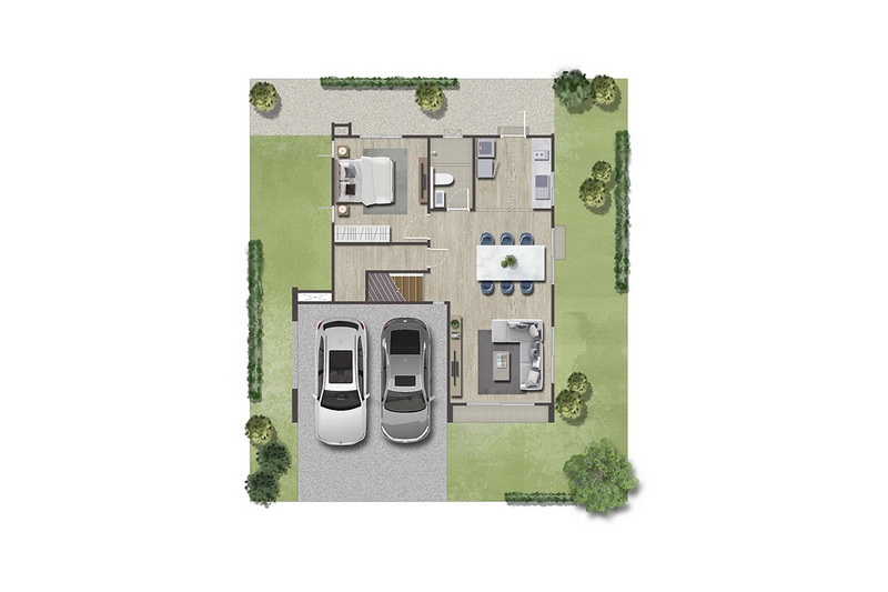 หน้าบ้านกว้างจอดรถยนต์ในร่มใต้ชายคาได้ 2 คัน สามารถถอยรถเข้า-ออกได้อย่างคล่องตัว พื้นเทคอนกรีตปาดเรียบโครงสร้าง On Beam แบบเดียวกับตัวบ้าน ส่วนนอกชายคาโครงสร้าง On Ground ฝ้าเพดานด้านในติดไฟให้แสงสว่างไว้ 1 ดวง