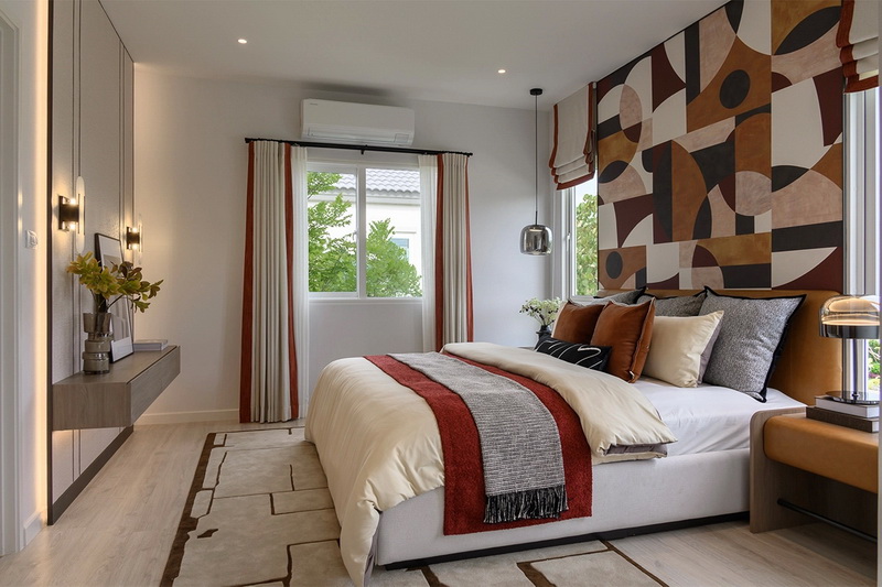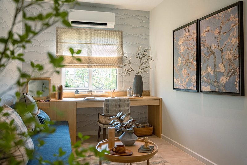 ฝั่งหัวเตียงมีหน้าต่างกระจกบานกระทุ้งทรงสูงให้ 2 บาน ด้านข้างวางโต๊ะขนาดกะทัดรัดได้ทั้ง 2 ฝั่ง ส่วนบ้านตัวอย่างวางไว้ 1 ฝั่งให้ดูระยะการใช้งาน