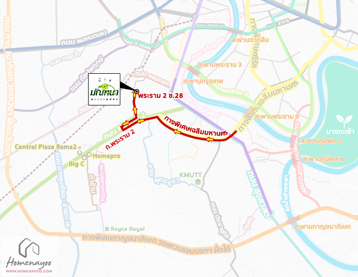สะพานจะพาเราลงมาที่ ถนนพระราม 2 ทางหลัก ค่ะ (โครงการจะอยู่ฝั่งตรงข้าม ต้องกลับรถ) เมื่อลงสะพาน ขับมา 500 เมตร จะเจอป้ายให้ชิดซ้าย ออกทางคู่ขนาน เพื่อไปสะพานกลับรถค่ะ