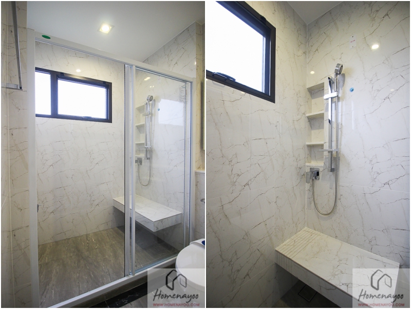 ภายในห้องน้ำจะติดตั้งฟังก์ชั่นมาให้ครบ แยกส่วนแห้งส่วนเปียก สุขภัณฑ์เป็นของ American Standard พื้นและผนังห้องน้ำปูกระเบื้องลายหินอ่อน พื้นห้องลดระดับลงต่ำกว่าส่วนห้องนอนประมาณ 5 เซนติเมตร