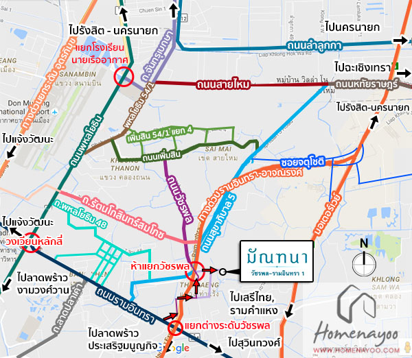 การเดินทางเริ่มจากแยกต่างระดับวัชรพล ถนนรามอินทรา ⇒ ถนนวัชรพล ⇒ ห้าแยกวัชรพล ⇒ ถนนร่วมมิตรพัฒนา ⇒ ซอยร่วมมิตรพัฒนา แยก 10 ⇒500 ม.⇒ บ้านมัณฑนา วัชรพล-รามอินทรา 1 *ใกล้ซอยรามอินทรา 65