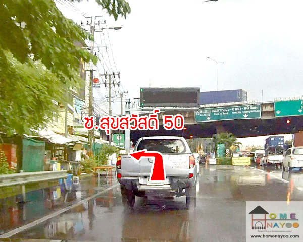 พอกลับรถ ขับตรงไปอีก 1.5 กม. เลี้ยวซ้ายเข้า ซ.สุขสวัสดิ์ 50 ซอยนี้จะอยู่ก่อนถึงทางด่วน