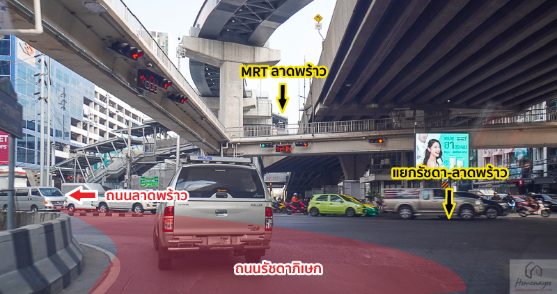 เลี้ยวซ้ายมาเข้าถนนลาดพร้าว จากนั้นให้เตรียมชิดซ้ายไว้ ซ้ายมือจะผ่านรถไฟฟ้าสายสีน้ำเงิน MRT ลาดพร้าว