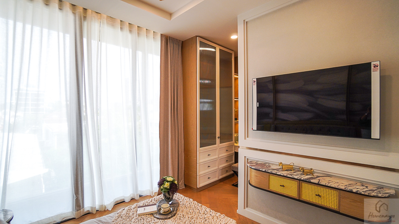 ฝั่งปลายเตียงติดทีวีจอขนาด 55-65 นิ้วได้ และยังวางโต๊ะทำงานได้อีก