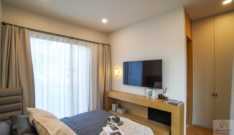 ห้องนอน 2 ตำแหน่งอยู่โซนหน้าบ้าน ให้พื้นที่มาเยอะพอสมควร วางเตียง 5-6 ฟุตได้พร้อมโต๊ะข้างเตียง ฝั่งปลายเตียงติดทีวีจอขนาด 55 นิ้วได้เลย
