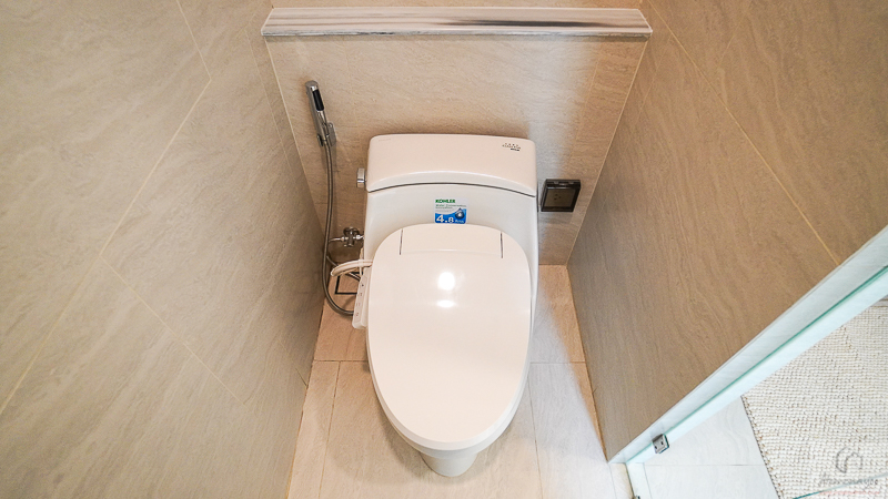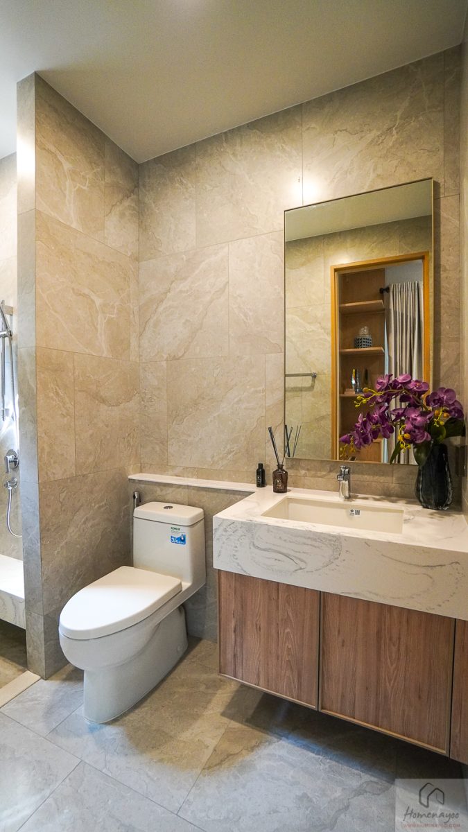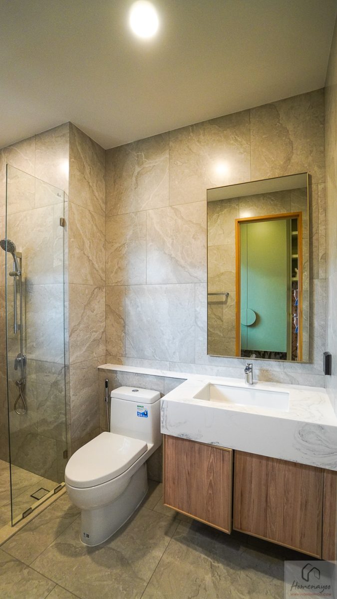 ภายในห้องน้ำจะได้แบบ Full Function แบ่งเป็นสัดส่วน พื้นและผนังตกแต่งด้วยกระเบื้องเซรามิกลายหิน ระบบน้ำเป็นแบบน้ำร้อนน้ำเย็นทั้งส่วนอ่างล้างมือ และส่วนอาบน้ำ