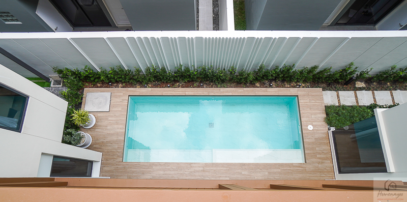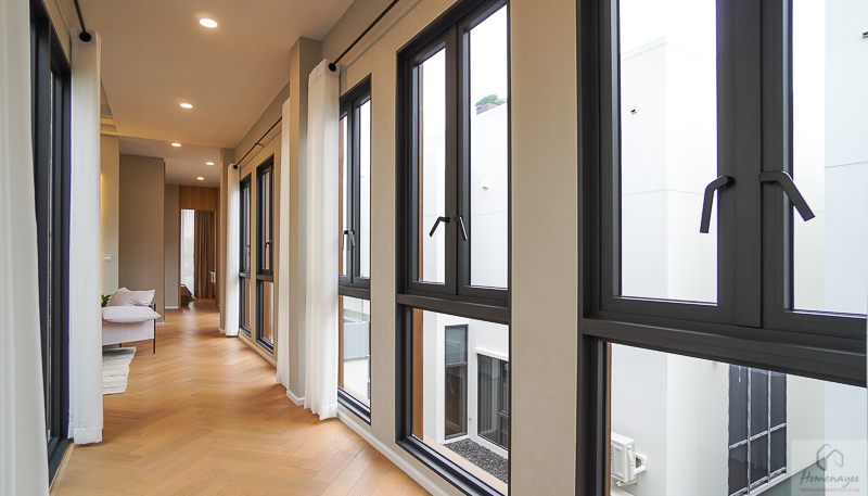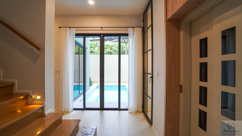 โถงทางเดินมีหน้าต่างเปิดมองเชื่อมออกมาเห็นสระว่ายน้ำหรือสวนข้างบ้านได้แบบนี้
