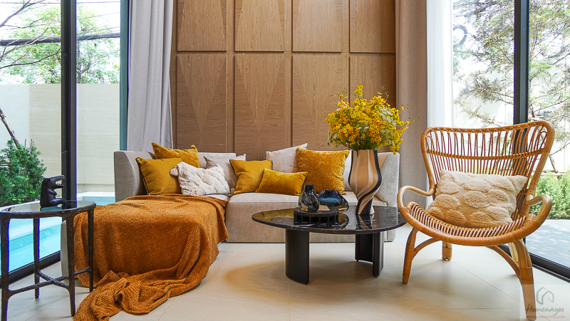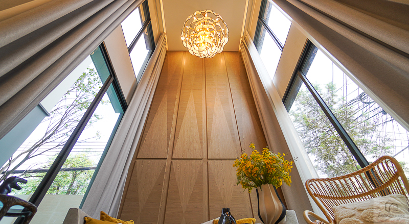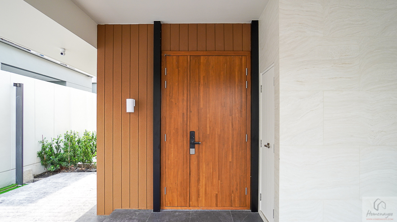 ส่วนวัสดุภายในบ้านได้ของดีมีคุณภาพ เริ่มตั้งแต่ประตูหน้าบ้านเป็นบานไม้จริง พร้อม Digital Door Lock พื้นชั้นล่างเป็นกระเบื้องเซรามิกขนาด 60 x 60 ซม. ลายหิน Travertine พื้นชั้น 2-3 เป็น Engineered Wood ปูลาย Herringbone ผนังจะติดวอลเปเปอร์ทั้งหลัง
