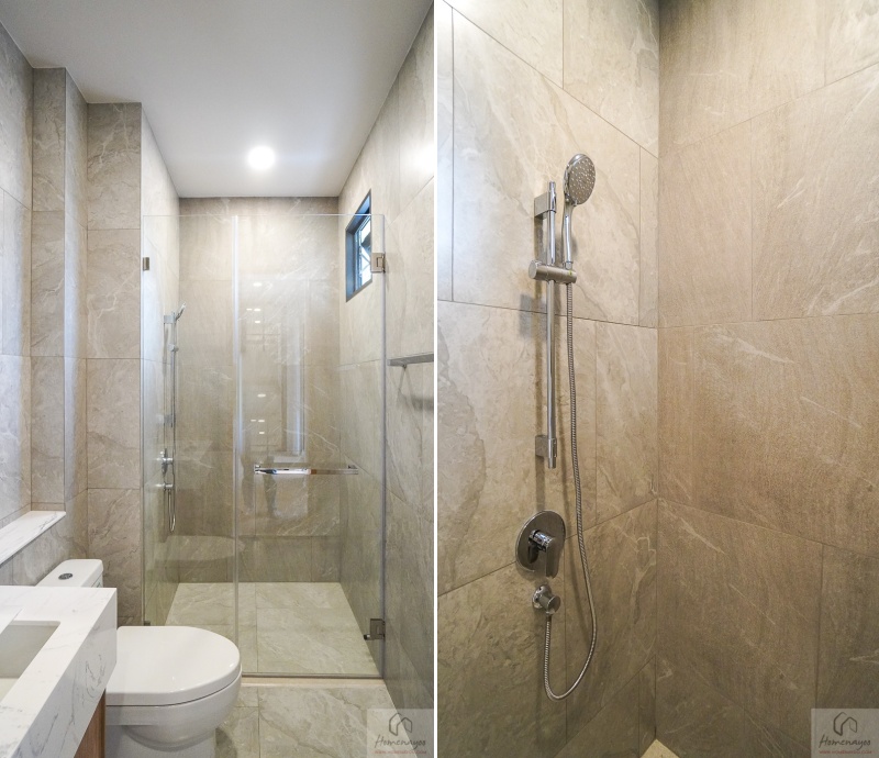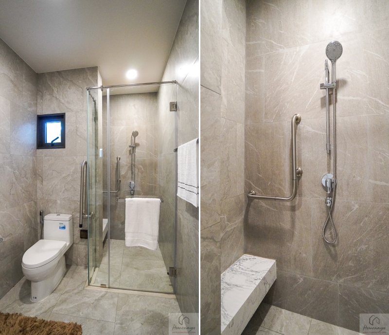 ถัดไปเป็นพื้นที่ส่วนเปียก ติดตั้งฉากกั้นอาบน้ำแบบบานเปิดมาให้ ด้านในติดตั้ง Hand Shower พร้อมก๊อกน้ำแบบผสมน้ำร้อนน้ำเย็น ในห้องน้ำมีช่องแสงเป็นบานกระทุ้งเปิดระบายอากาศได้