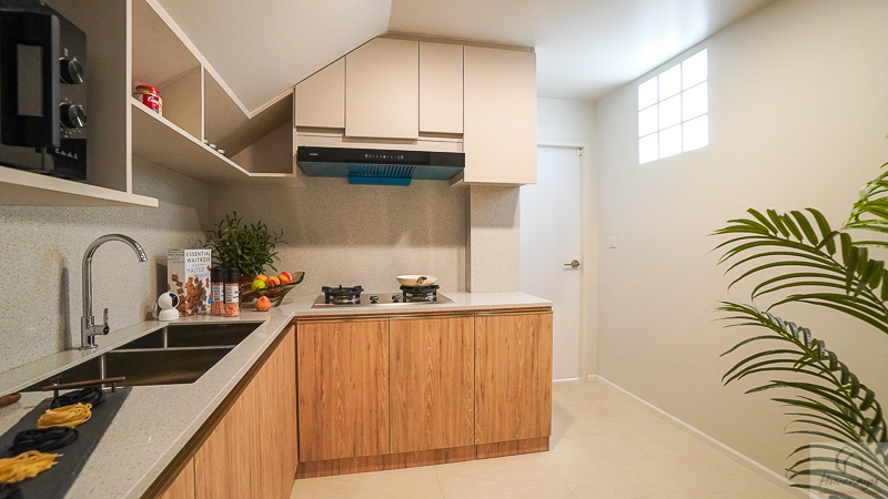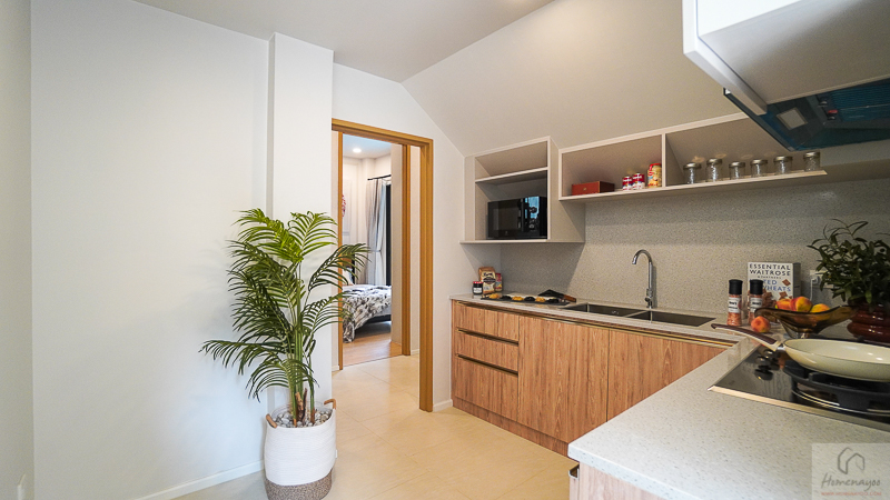บ้านตัวอย่างตกแต่งเป็นส่วนครัวฝรั่งมาให้ดู และมีพื้นที่วางตู้เย็นได้อีก ด้านข้างมีช่องแสงขนาดใหญ่มีส่วนที่เปิดระบายอากาศได้อีกด้วย