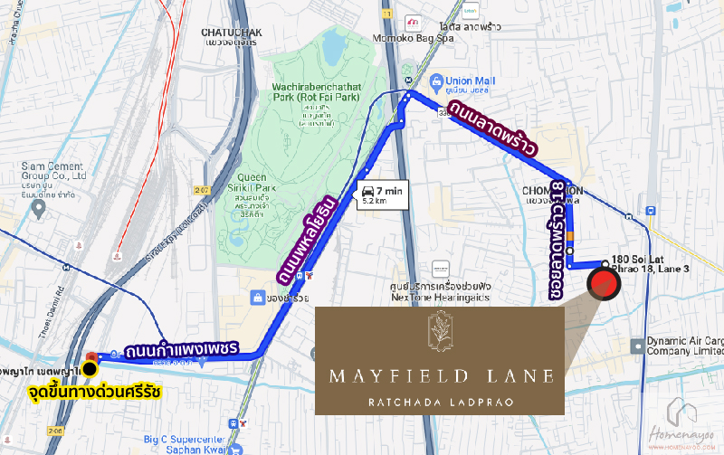 Mayfield Lane รัชดา-ลาดพร้าว ตั้งอยู่ในซอยลาดพร้าว 26 จุดเด่นของซอยนี้คือเชื่อมต่อเข้าออกได้ทั้งจากถนนลาดพร้าว, ถนนรัชดาภิเษก และถนนวิภาวดีรังสิต ช่วยให้การเดินทางสะดวก ใกล้ทางด่วนโทลล์เวย์ และทางด่วนศรีรัช
