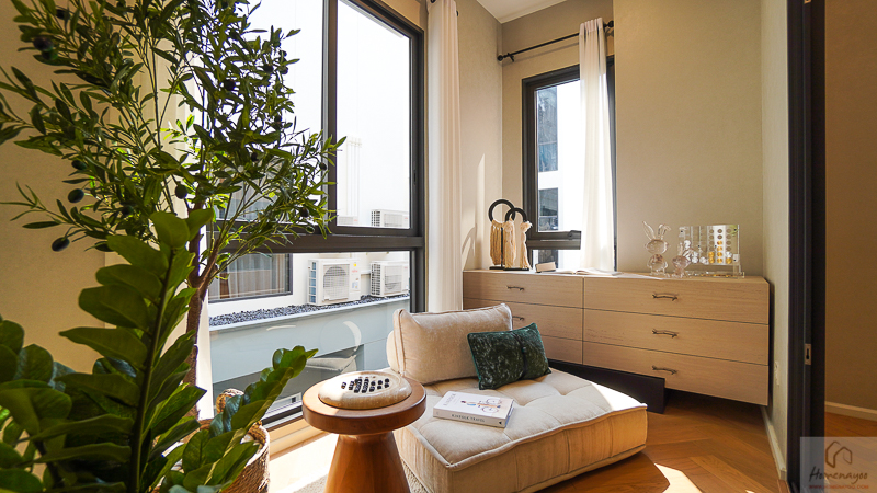 กลับเข้ามาในห้อง ซ้ายมือมีพื้นที่ให้ทำเป็นมุมนั่งเล่นพักผ่อนได้อีกจุด ขวามือเป็นส่วน Walk-in closet ทำประตูกั้นแยกส่วนได้