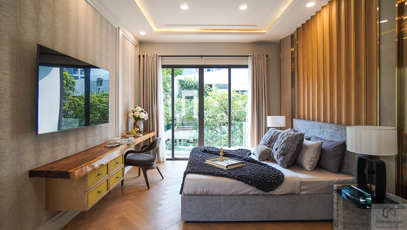 พื้นที่วางเตียง King Size พร้อมโต๊ะข้างเตียงได้สบาย ๆ มีพื้นที่เหลือเดินได้รอบเตียง ปลายเตียงวางชุดโซฟาเป็นมุมนั่งพักผ่อนส่วนตัวได้อีก