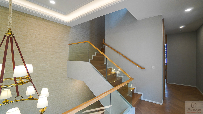 จากโถงบันไดมองเชื่อมลงมาที่ชั้นล่างจะเป็นสระว่ายน้ำหรือสวนข้างบ้านพอดี
