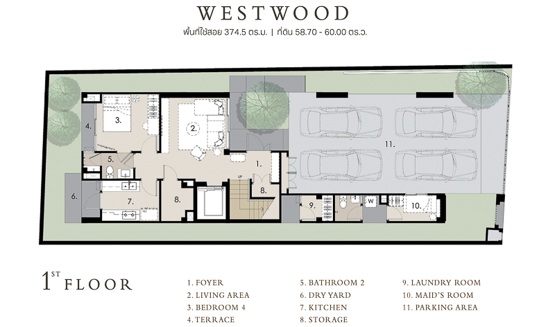 Westwood บ้านเดี่ยว 3 ชั้น ที่ดินเริ่ม 58.70-60 ตร.ว. พื้นที่ใช้สอย 374.5 ตร.ม. ฟังก์ชัน 4 ห้องนอน, 5 ห้องน้ำ, 2 ห้องนั่งเล่น, 1 ห้องอเนกประสงค์, 2 ครัว (ไทยและยุโรป), 1 Double Volume, 1 คอร์ทกลางบ้าน, 1 ลิฟต์, 1 ห้องแม่บ้าน, 4 ที่จอดรถ