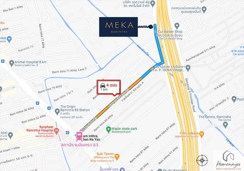 ถึงซอยรามอินทรา 83 แล้วเราเลี้ยวเข้าซอยแล้วขับตรงเชื่อมออกมาบนถนนเลียบวงแหวนกาญจนาภิเษก แล้วเลี้ยวซ้ายและขับต่อไปอีกประมาณ 240 ม. ก็จะถึงที่ตั้งโครงการ MEKA รามอินทราค่ะ