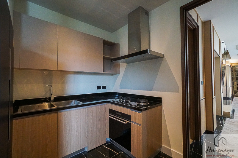 ติดกันเป็นครัวไทย กั้นแยกมาให้เป็นสัดส่วน พร้อมติดตั้งเคาน์เตอร์ครัวและอุปกรณ์ต่าง ๆ ทั้งซิ้งค์ล้างจาน, เตาแก๊ส, Microwave Oven และเครื่องดูดควัน มาให้พร้อมใช้งาน