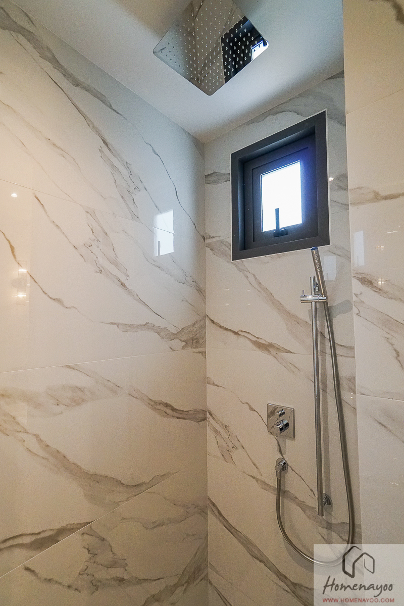 ภายในห้องน้ำใช้กระเบื้องลายหินอ่อนสีขาวทั้งหมด ดูหรูหราเลยทีเดียว และใส่ฟังก์ชันมาให้แบบครบ ทั้งอ่างล้างมือ, โถสุขภัณฑ์, โซน Shower และอ่างอาบน้ำ