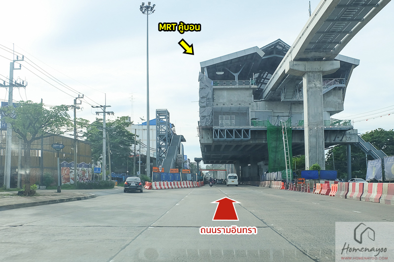 พอเราออกมาสู่ถนนรามอินทราแล้วเราขับตรงกันต่อมาค่ะ เราจะผ่านแนวรถไฟฟ้าสายสีชมพู สถานีแรกที่เราขับผ่านคือ MRT คู้บอน