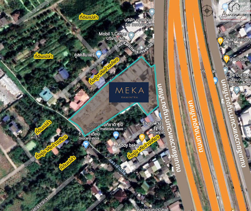 โครงการ MEKA รามอินทรา ตั้งอยู่บนถนนเลียบวงแหวนกาญจนาภิเษก ใกล้ถนนรามอินทรา ประมาณ 1 กม. ค่ะ จึงเป็นทำเลที่อิงความอุดมสมบูรณ์บนเส้นรามอินทราได้เลย ซึ่งภาพรวมของย่านนี้เป็นย่านของที่อยู่อาศัยและออฟฟิศขนาดย่อม ๆ ที่มีความหลากหลาย นับว่ามีความอุดมสมบูรณ์อยู่พอสมควร ทั้ง ห้างสรรพสินค้าขนาดใหญ่, Hypermarket, Community Mall, Supermarket รวมถึงตลาดนัดตอนกลางคืน