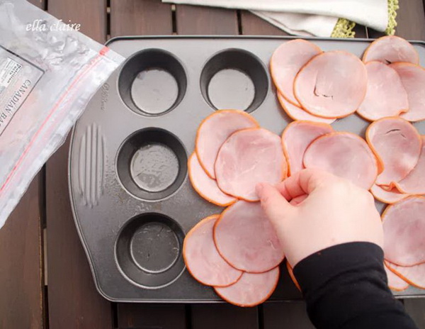 1. ฉีดพิมพ์มัฟฟินด้วยสเปรย์กันติดเตรียมไว้ หลังจากนั้นนำเบคอนชิ้นหนา 3 ชิ้น มาวางซ้อนกันแบบในภาพ และกดให้เบคอนลงไปในพิมพ์มัฟฟิน