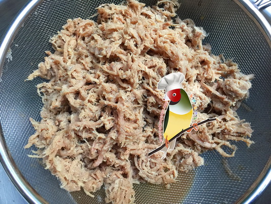 2. เมื่อเราต้มหมดสุกแล้ว เอาขึ้นพักไว้ให้เย็น แล้วฉีกเป็นเส้นๆ