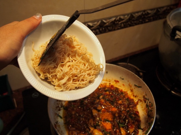 11. ปรุงรสเสร็จ ก็ใส่เส้นมาม่าลงไปผัด ผัดให้เข้ากันเลย