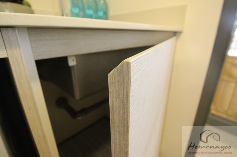 ชุด Pantry ที่ได้นั้นได้บานเปิดแบบ Soft Close ด้านบนใช้วัสดุแบบ Glossy และด้านล่างติดผิวด้วยลามิเนต ภายในมีช่องให้เก็บของพอสมควรค่ะตามพื้นที่ที่ค่อนข้างจำกัด