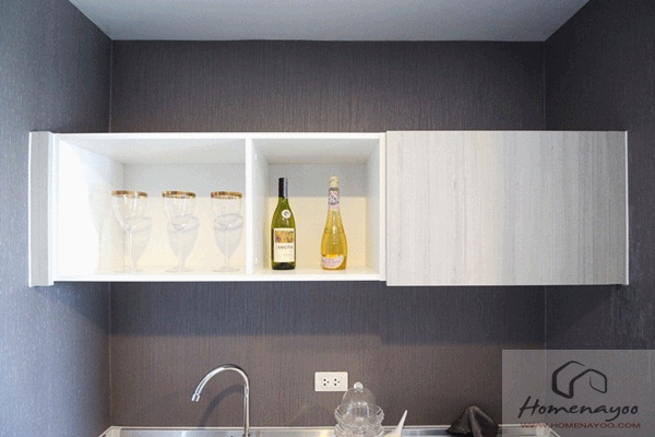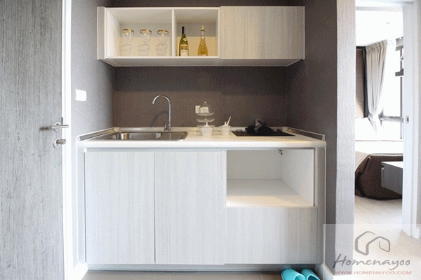 ชุดครัวที่ได้จะเป็นเคาน์เตอร์สำเร็จรูปพร้อมตู้ลอย มีก๊อกน้ำอ่างล้างจานให้ค่ะ ส่วนเตาไฟฟ้าและเครื่องดูดควันจะมีเฉพาะใน unit 2 ห้องนอนเท่านั้น ห้อง one bedroom ที่เราพามาชมนี้จะไม่มีให้นะคะ
