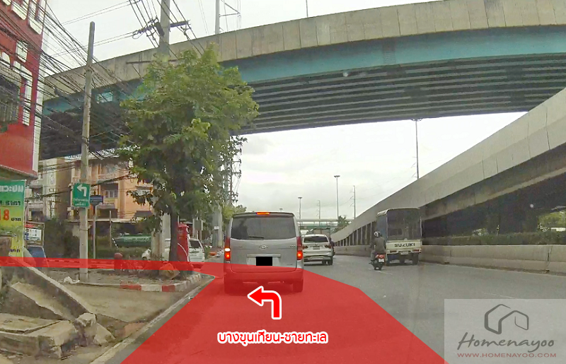 เลี้ยวซ้ายเข้าสู่ถนนบางขุนเทียน-ชายทะเล โดยมีจุดสังเกตง่ายมากคือปากทางเข้าจะมีสะพานลอยข้ามแยกจากบางขุนเทียนไปยังเอกชัย