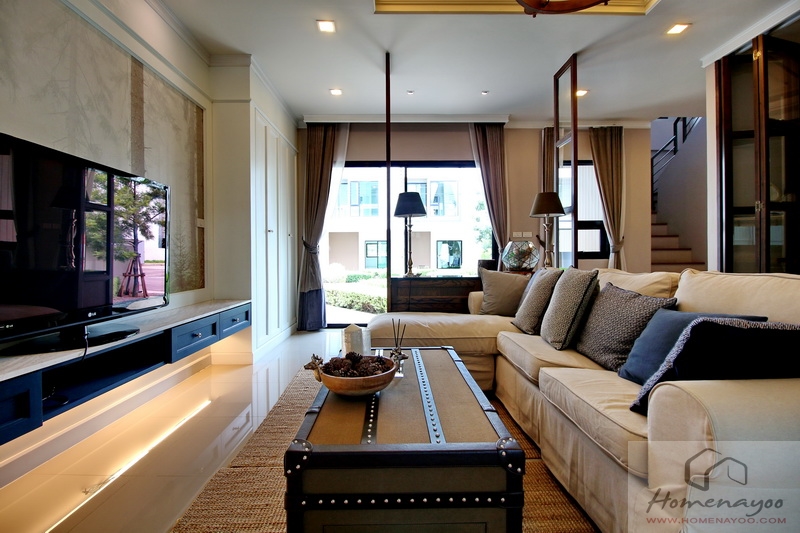 ภายในบ้านโครงการตกแต่งเป็นสไตล์ Modern Contemporary วางชุดโซฟานั่งเล่นหรือรับแขกขนาดใหญ่ ด้วนพื้นที่ที่กว้างขาวอาจเลือกใช้โซฟาที่รองรับการใช้งานได้ 5-6 คนเลยทีเดียว