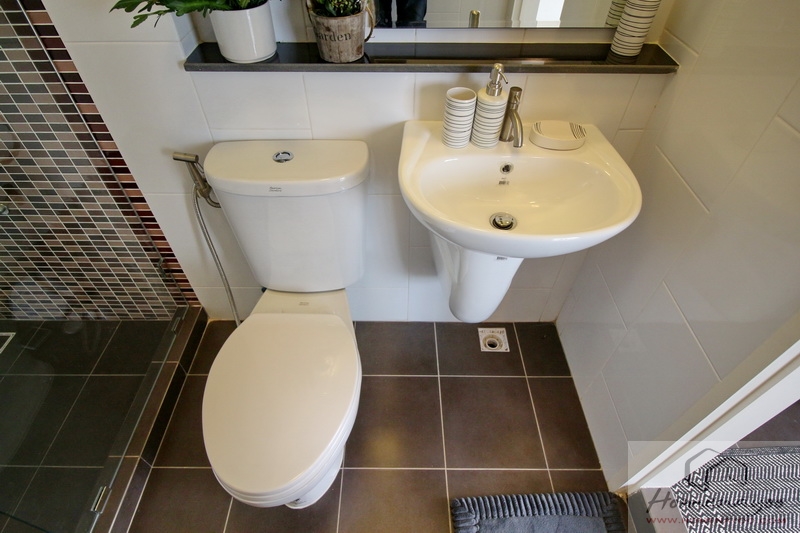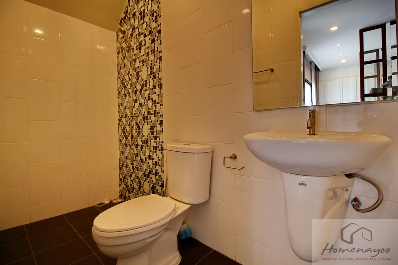 ห้องน้ำชั้นล่าง มีแยกพื้นที่ส่วนแห้งและส่วนเปียก โดยก่อธรณีและติดตั้งฉากกระจกนิรภัยให้ ป้องกันน้ำกระเด็นเข้ามายังส่วนแห้ง