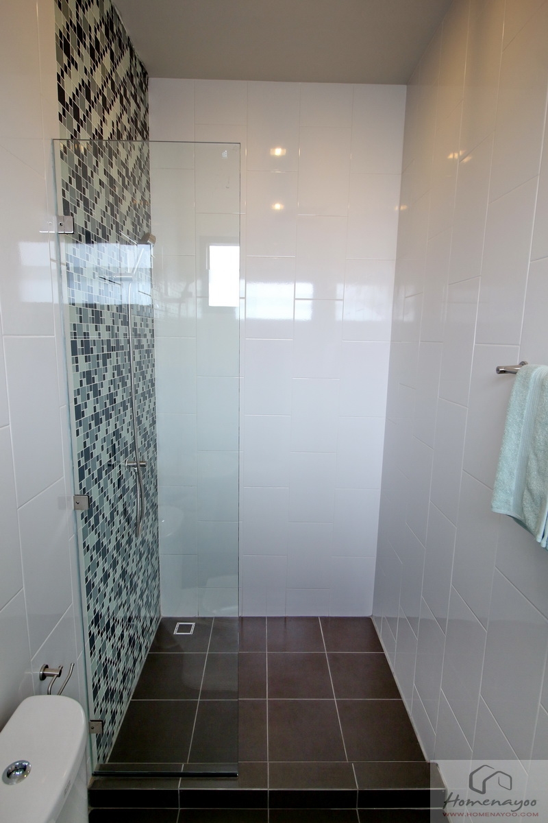 ห้องอาบน้ำติดตั้งฉากกระจก Temper บานสวิง ก่อธรณีกันน้ำไหล