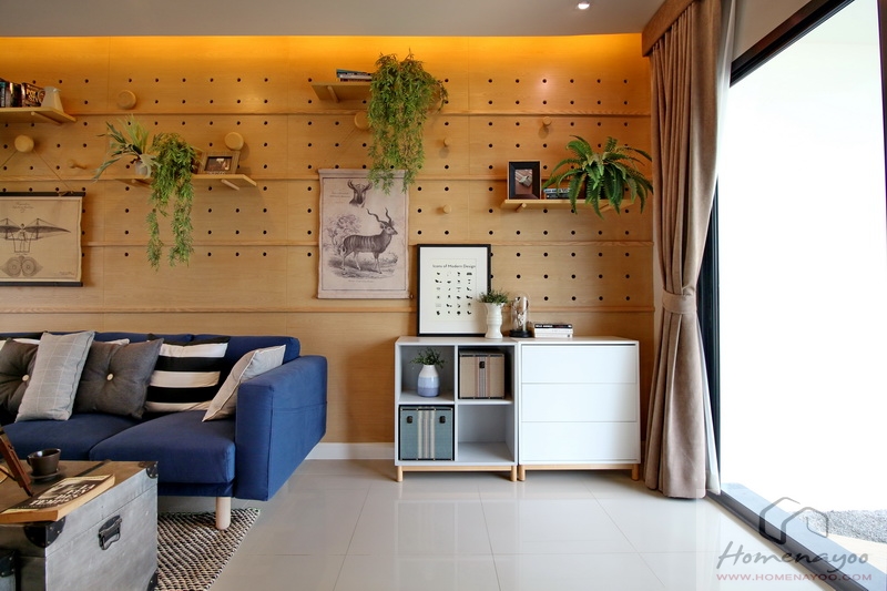 มุมมองย้อนกลับไปทางฝั่งหน้าบ้าน จะเห็นได้ว่าระยะห่างระหว่างโซฟาถึงชั้นวางทีวี กว้างราวๆ 4 เมตร เดินผ่านตรงจุดนี้ไปยังครัวหรือห้องน้ำได้อย่างสะดวก